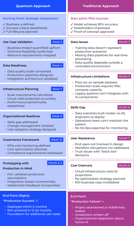 Sure, your team could spend 6-12 months learning AI implementation best practices through a guess-and-check approach, or you can hire any vendor to “do AI”. But if you want reliable outcomes instead of experiments, you need a partner who understands the business side as deeply as the technical one. This is where Quantum stands out.