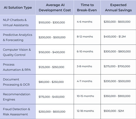 Having analyzed 50+ enterprise AI projects Quantum built for clients, we’ve prepared a simple table comparing the average development expenses versus potential financial returns.