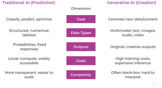 - Goal: traditional AI improves efficiency and is good at specific scenarios; generative AI sparks innovation and is able to generate new content.